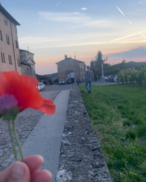 De zon ging onder en nadat ik me verwonderd had over de manier hoe de natuur zich overal doorheen manoeuvreert. Voor de beelddenkers: dan sta ik dus even naar de kerk te kijken en zie ik hoe daar dus ‘onkruid’ uitkomt, dan fascineer ik me toch. Ook hoe de constructies bedacht zijn en de manier waarop de stenen zich stapelen, symbolisch geïnterpreteerd kunnen worden. En ook op deze plek stonden her en der klaprozen tussen de wijnranken. Allermooist!